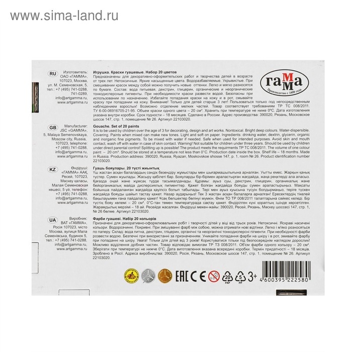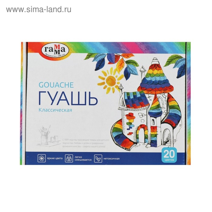 Гуашь 20 цветов по 20 мл Гамма "Классическая", картонная упаковка 22103020