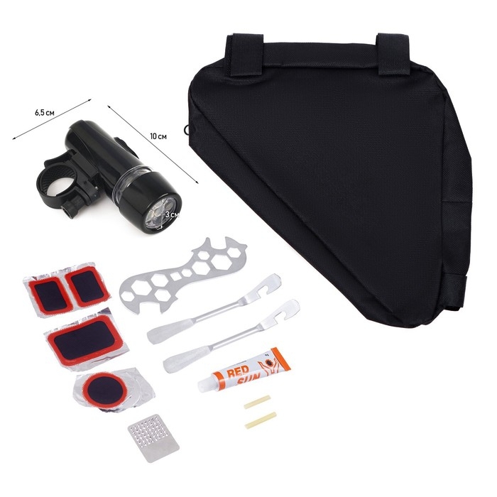 Набор для велосипеда 2 в 1: ремонтный набор, сумка 20 х 20 х 27 см. Набор инструментов для велосипеда необходим для выполнения различных работ по обслуживанию и ремонту велосипеда. С помощью такого набора вы сможете самостоятельно устранить большинство неисправностей, а также провести профилактический осмотр и настройку своего велосипеда. Например, можно заменить камеру или покрышку, настроить тормозную систему, выполнить ремонт рамы или вилки. В набор входит: черная сумка из оксфорда, 1 комбинированный (семейный) ключ выполнен из металла, 2 монтировки (монтажки) для перебортовки колес, выполнены из металла, 5 заплаток для шин, 1 клей, 1 наждачка для зачистки, 2 резинки на ниппель, черный фонарик (10 х 6,5 см). Фонарь велосипедный передний, 50 лм, 5 led, 4 ААА, 3 режима. Специально для вашей ночной или вечерней поездки. Универсальность и безопасность - вот главные характеристики данной модели. Вы можете взять его с собой, например, в поход, на рыбалку, или же он вам пригодится во время кемпинга.