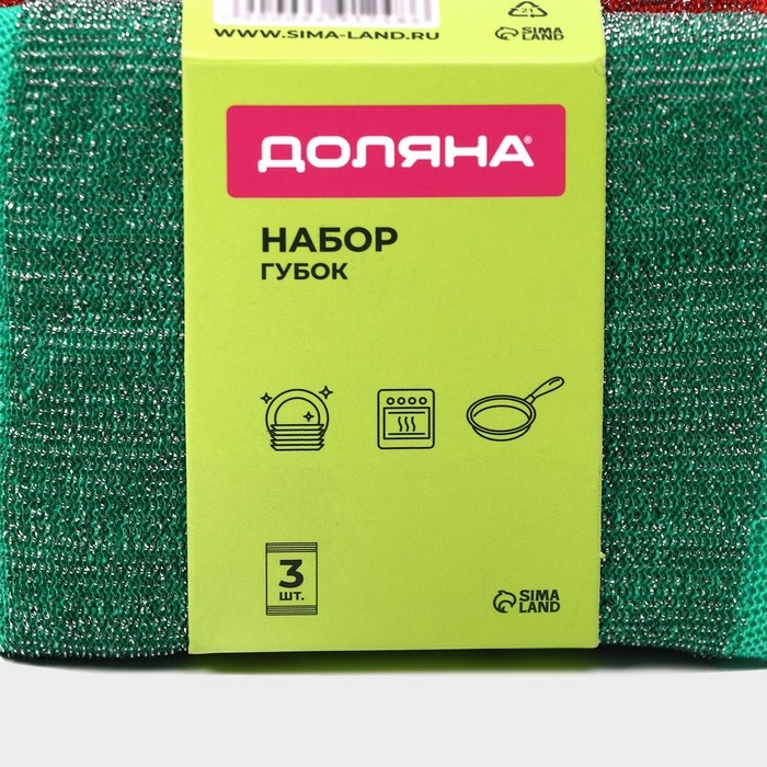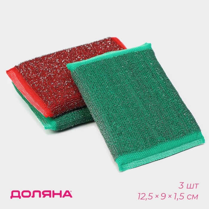 Набор губок скраберов для мытья посуды со стальной стружкой Доляна, усиленые, 3 шт, 13×9×1,5 см