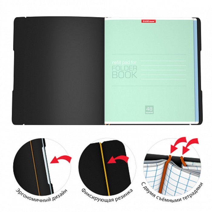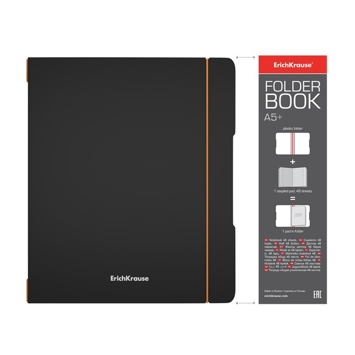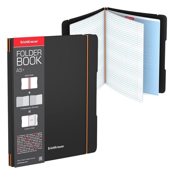 Тетрадь А5, 96 листов в клетку ErichKrause "FolderBook Accent" на резинке, сьемная черная пластиковая обложка, блок офсет, белизна 100%