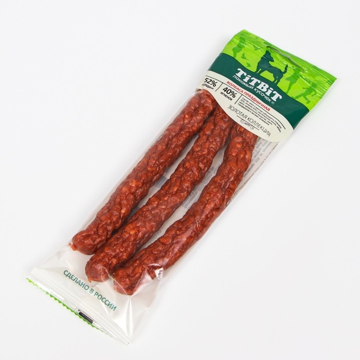 Золотая коллекция – это линейка лучших лакомств TITBIT, разработанных при участии владельцев домашних животных и их питомцев. Колбаса «Праздничная» считается элитой среди колбас для собак и излюбленным угощением четвероногих. Тщательно отобранная говядина с добавлением мяса ягненка лучшее угощение не только по особым случаям.