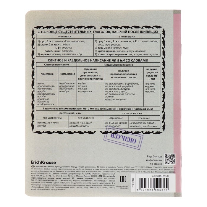 Комплект тетрадей по 12 основным учебным предметам: русский язык, литература, алгебра, геометрия, физика, химия, биология, география, история, обществознание, английский язык, информатика. Удобный вариант для приобретения на целый учебный год или в подарок. Каждая тетрадь объемом 36 листов имеет инфо-блок на 2 страницы с кратким изложением школьной программы. Упаковка - картонная обечайка в термоусадочной пленке.