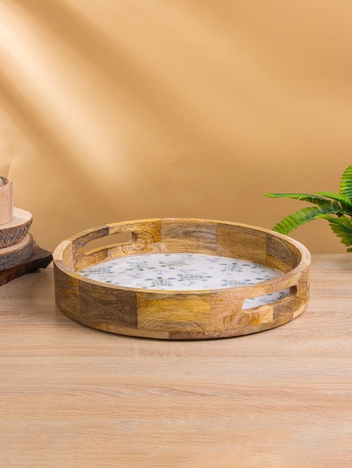 Поднос круглый с бортиками "Черепаха и цветы" дерево манго 35х35х6,5 см