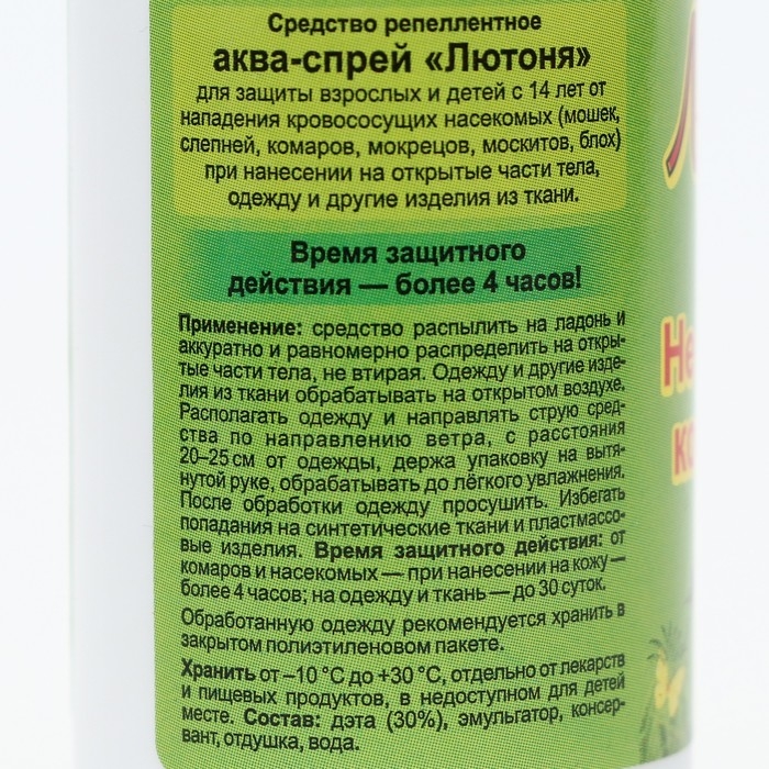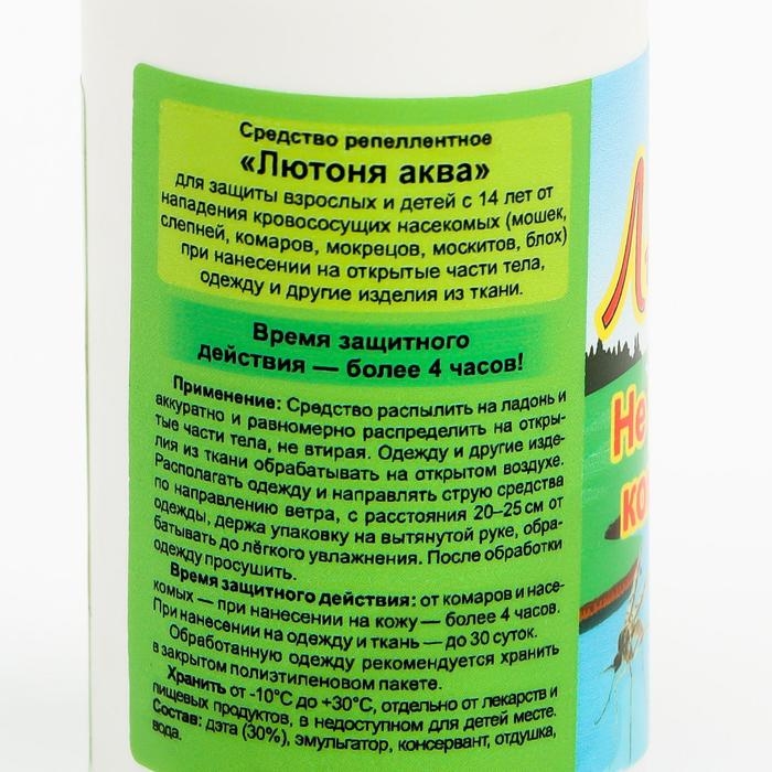 Аква-спрей от комаров «Лютоня» - средство репеллентное «Лютоня АКВА» для защиты взрослых и детей с 14 лет от нападения кровососущих насекомых (мошек, слепней, комаров, мокрецов, москитов, блох) при нанесении на открытые участки тела, одежду и другие изделия из ткани.