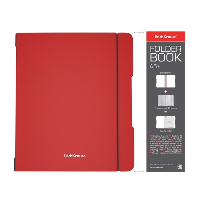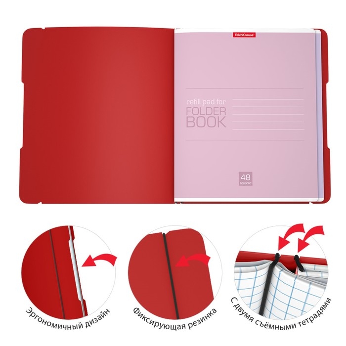 Тетрадь А5+, 96 листов в клетку ErichKrause "FolderBook", съёмная пластиковая обложка, на резинке, блок офсет, белизна 100%, красная