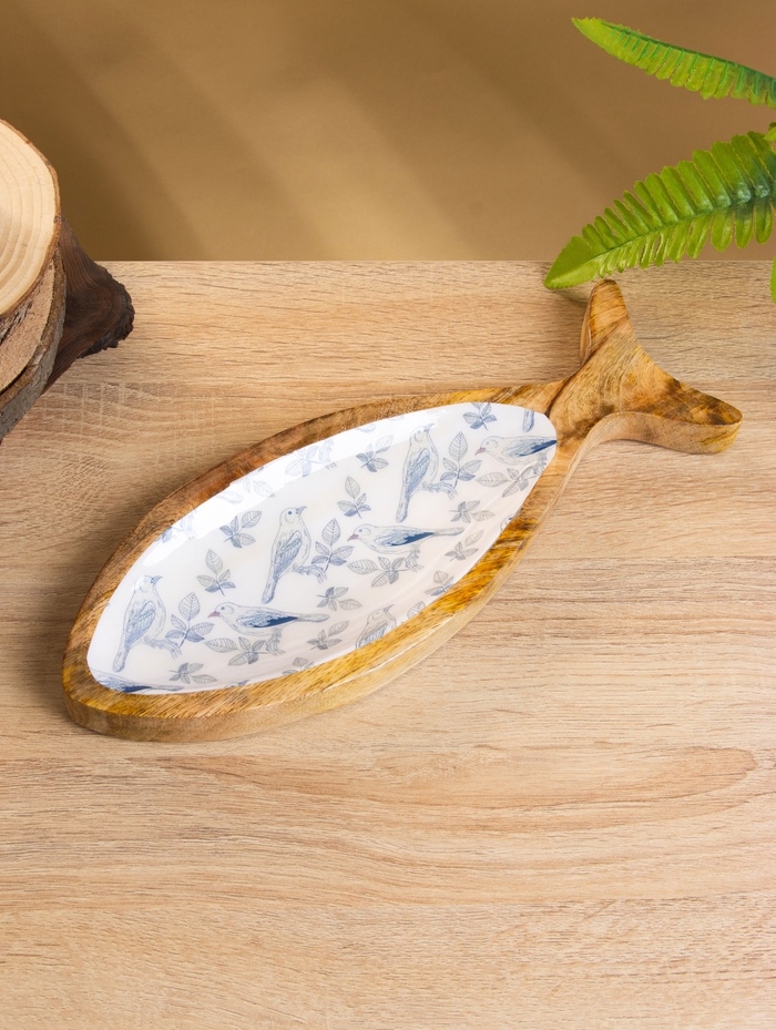 Блюдо в форме рыбки "Синие птицы" дерево манго 32х11,5х2 см