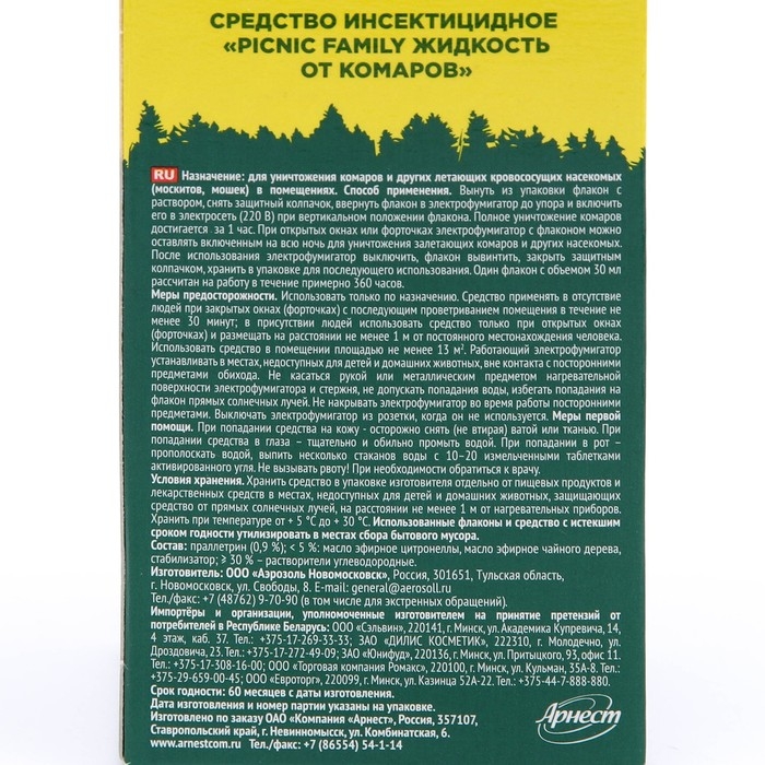 Дополнительный флакон-жидкость от комаров "Picnic Family", с растительными экстрактами, 45 ночей, 30