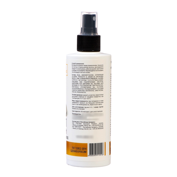 Способ применения: перед использованием необходимо встряхнуть флакон, затем нанести средство на чистые и слегка подсушенные волосы, распределить его по всей длине, избегая корней, и приступить к укладке. Смывать термозащитный спрей не требуется. Рекомендуется применять его после каждого мытья головы.