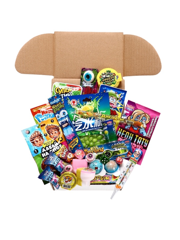 Этот набор сладостей создаёт атмосферу веселья и радости на празднике. Каждый элемент подарка дарит улыбку и возможность поделиться сладким настроением с друзьями. Сделайте любой день особенным с этим вкусным подарком!