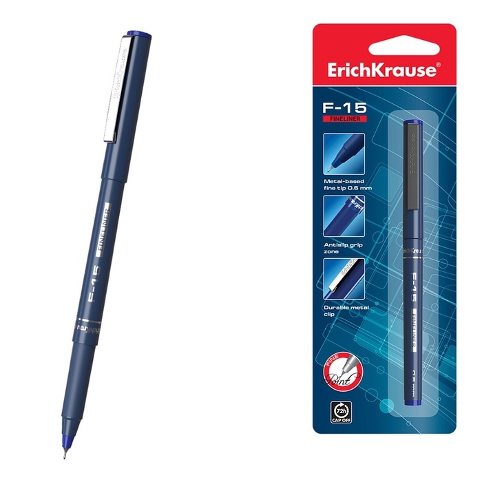 Ручка капиллярная Erich Krause F-15, узел 0.6 мм, чернила синие, длина линии письма 400 метров, в блистере