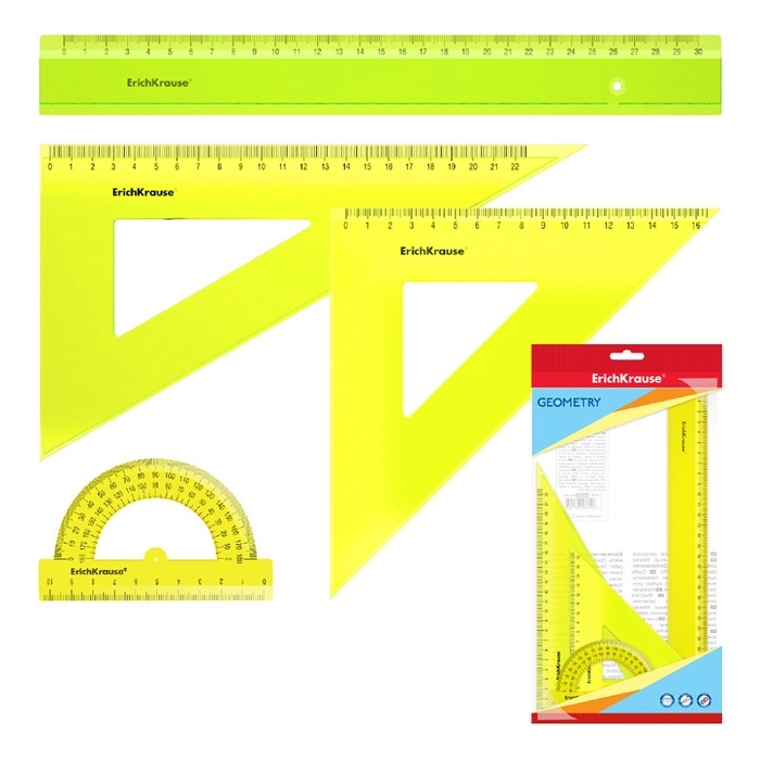 Набор чертёжный ErichKrause Neon, большой (линейка, 2 угольника, транспортир), прозрачный, в флоупаке