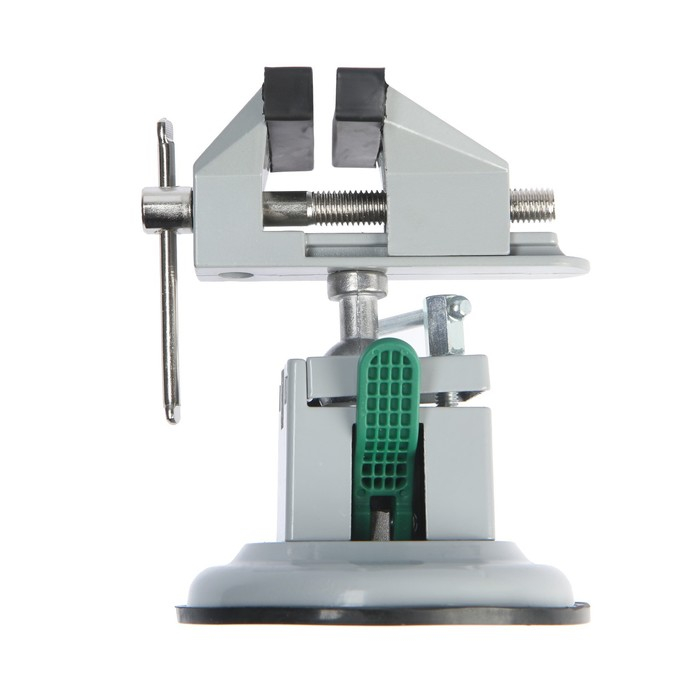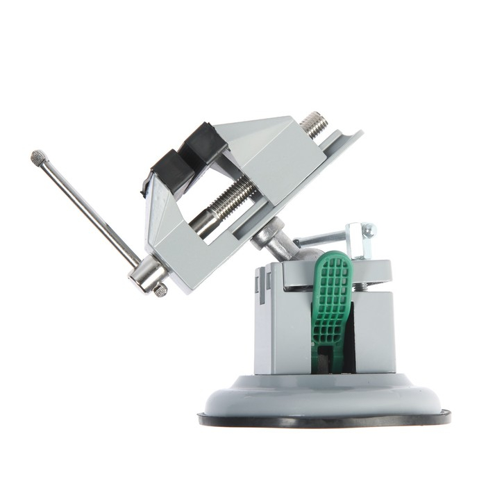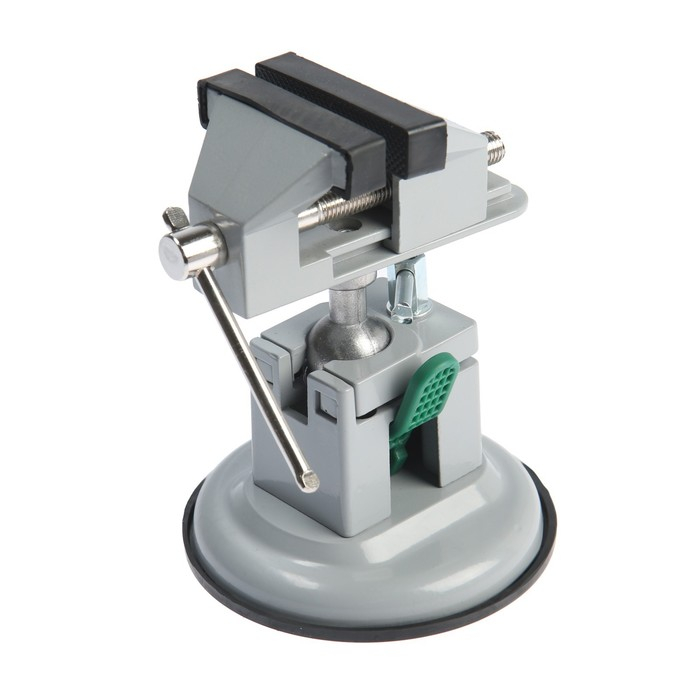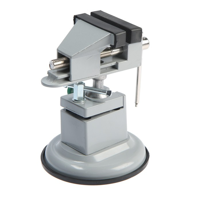 Модель изготовлена из алюминиевого сплава. Тиски оснащены резиновой вакуумной присоской в нижней базовой части, позволяющей крепить тиски к любым ровным поверхностям, а также шарнирным механизмом, что позволяет вращать и фиксировать рабочую верхнюю часть инструмента под нужным углом.