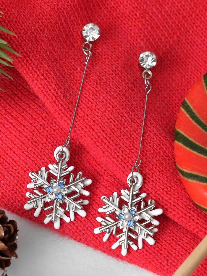 Серьги висячие со стразами «Новогодние» две снежинки, цвет бело-голубой в серебре