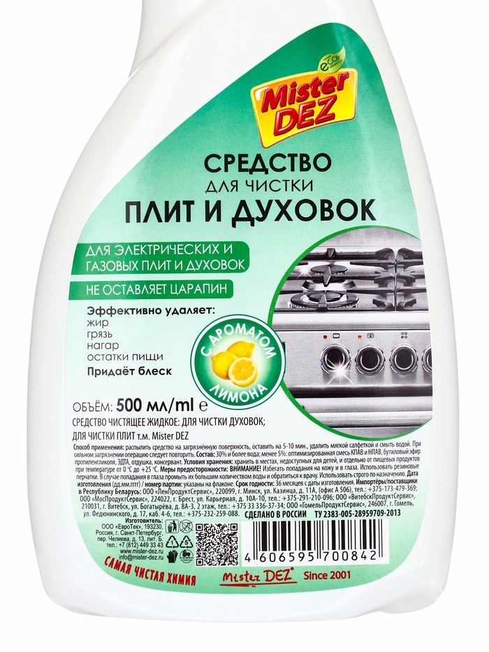 Mister Dez Eco-Cleaning Средство для чистки плит и духовок "Лимон", на основе коплекса ПАВ, 500 мл