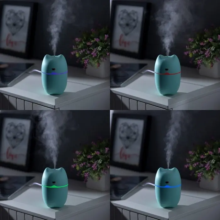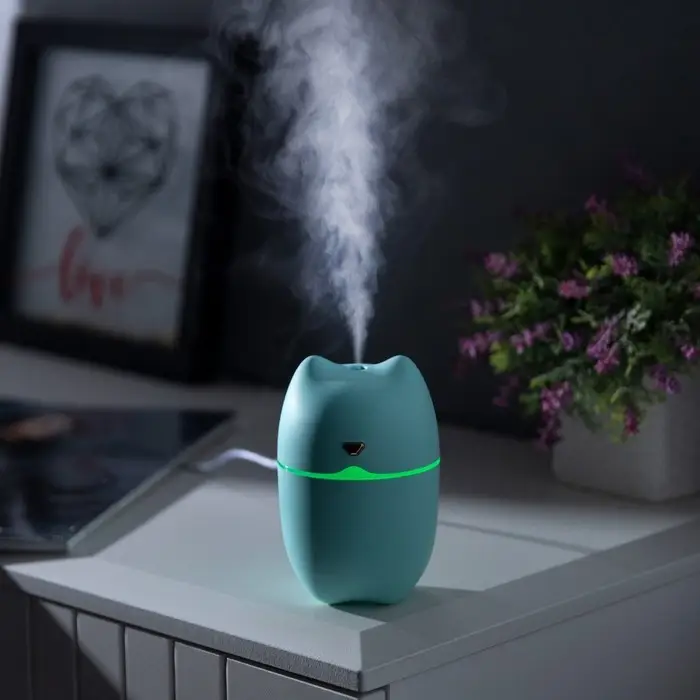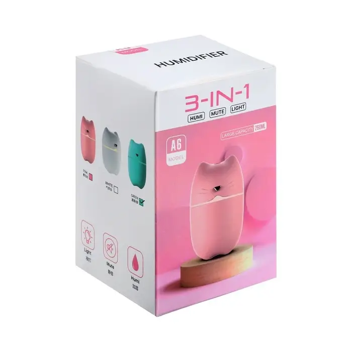 Простое управление делает увлажнитель доступным для ребёнка. Вам понадобится только одна кнопка, которой можно управлять интенсивностью испарения и цветом подсветки. Своей формой увлажнитель напоминает котика с ушками и золотым носиком. Он понравится вашему ребёнку и хорошо впишется в детскую комнату.