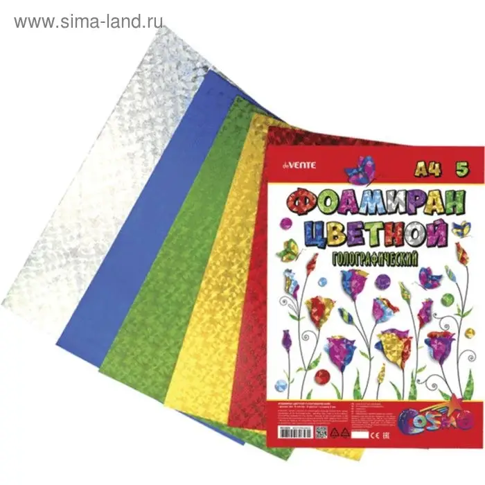 Фоамиран цветной голографический A4 deVENTE 5 цветов, 5 листов, толщина 2 мм, пластиковый пакет с европодвесом.