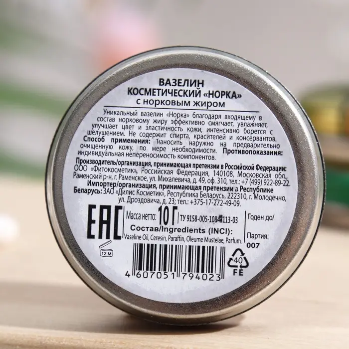 Вазелин косметический "Норка" с норковым жиром, 10 г