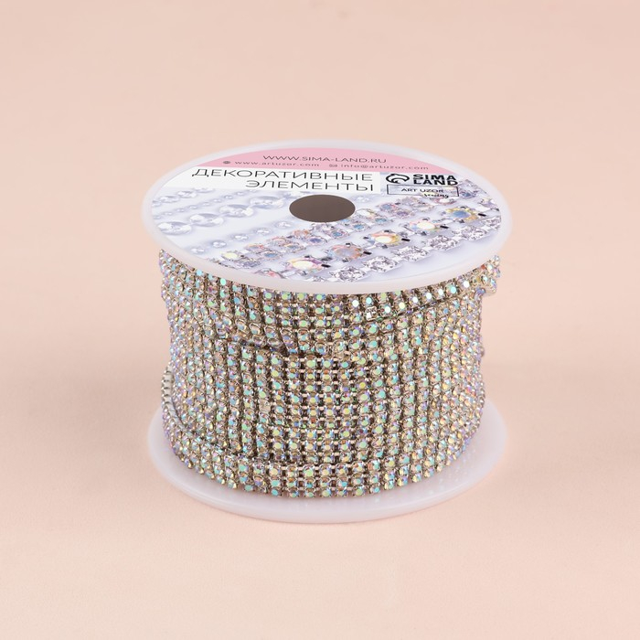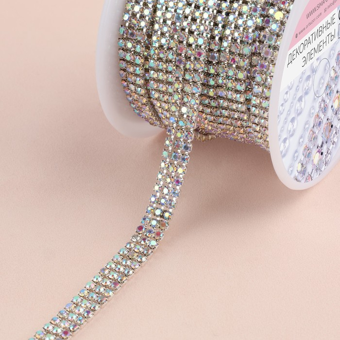 Цепь со стразами, с голографией, 3 ряда, металл, стекло, 6 мм, 4,5 ± 0,2 м, цвет серебряный