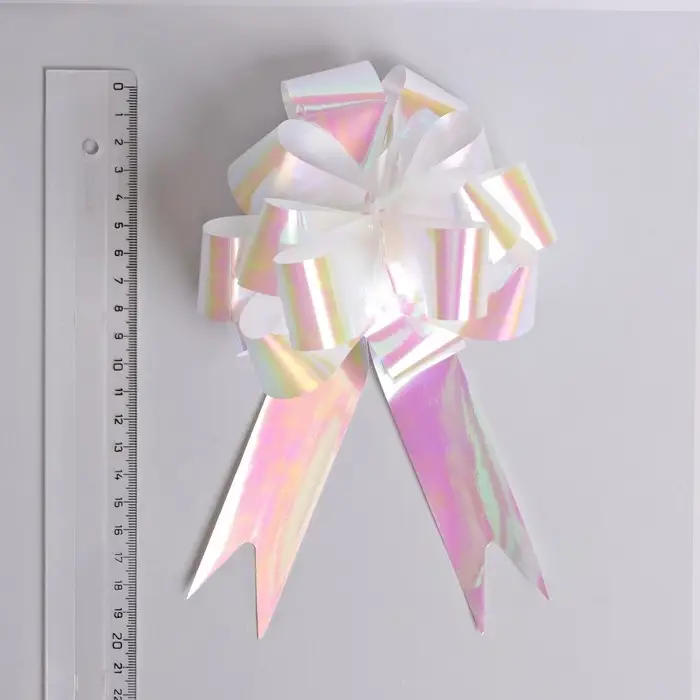 Для того чтобы собрать бант, надо потянуть за две ленточки, находящиеся между широкими лентами, удерживая широкие ленты в месте спайки. Бант собирается за несколько секунд.