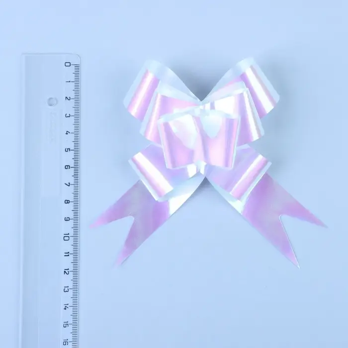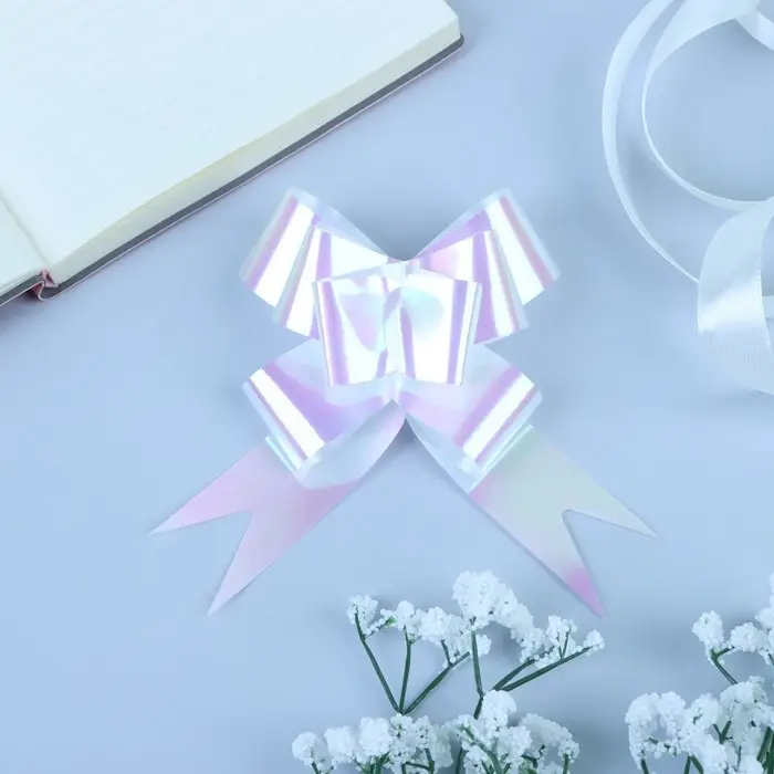 Применение: Для того чтобы собрать бант, надо потянуть за две ленточки, находящиеся между широкими лентами, удерживая широкие ленты в месте спайки.