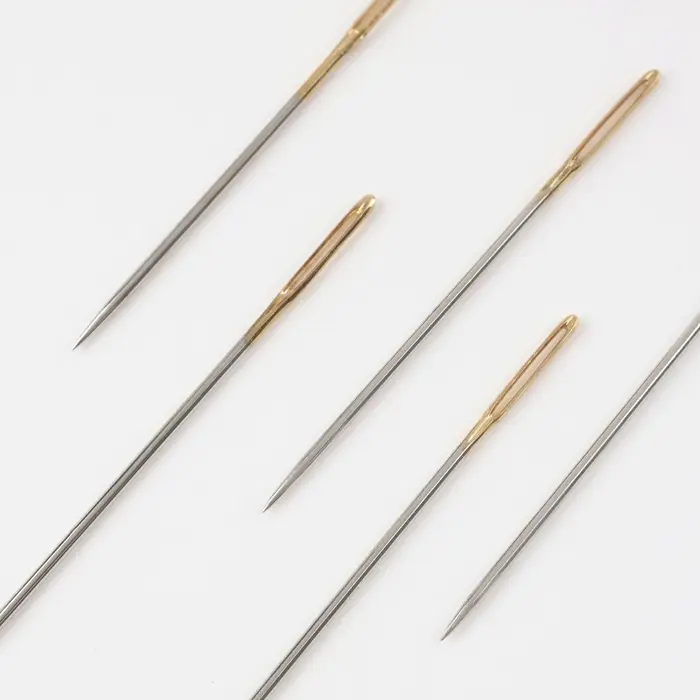 Позолоченное ушко значительно упрощает вдевание: оно идеально гладкое и не цепляет материал. В процессе шитья уменьшается нагрузка на нить, она меньше истирается. Остриё легко прокалывает полотно и позволяет проложить ровные стежки.