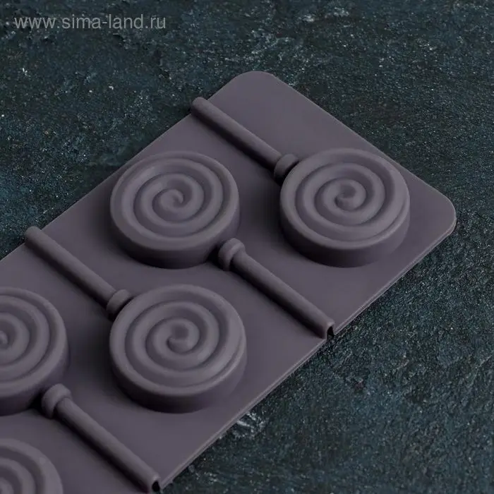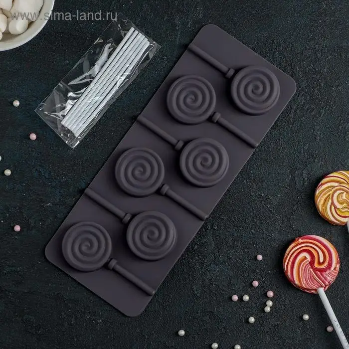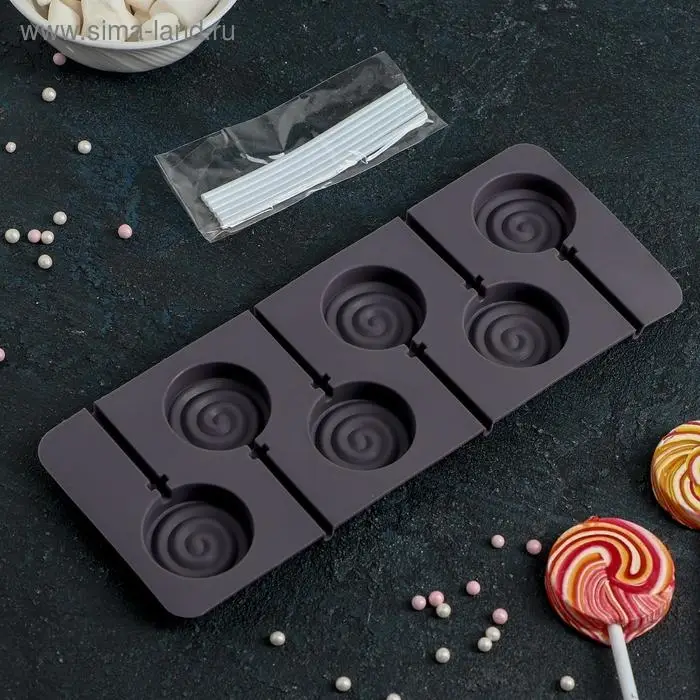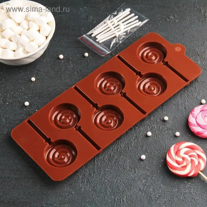 Форма для леденцов Доляна «Поцелуй», силикон, 24×9,4×1,5 см, 6 ячеек (4×2,4 см), с палочками, цвет коричневый