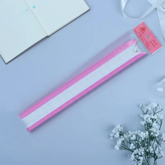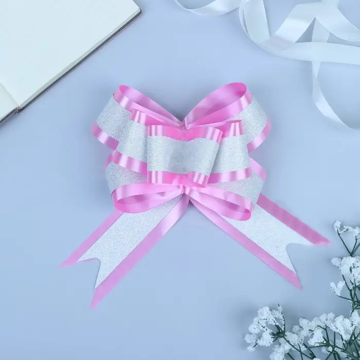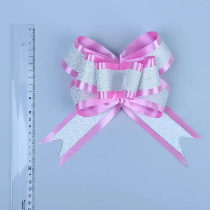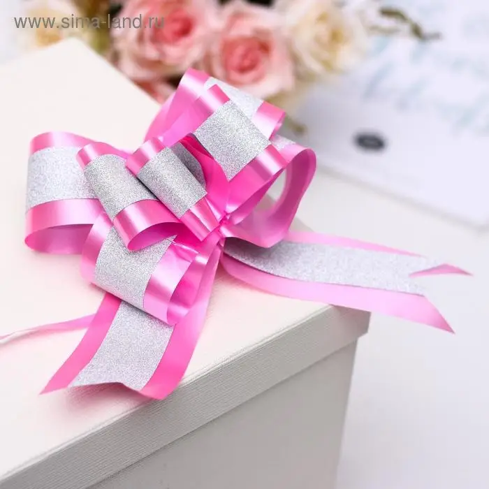Применение: Для того чтобы собрать бант, надо потянуть за две ленточки, находящиеся между широкими лентами, удерживая широкие ленты в месте спайки.