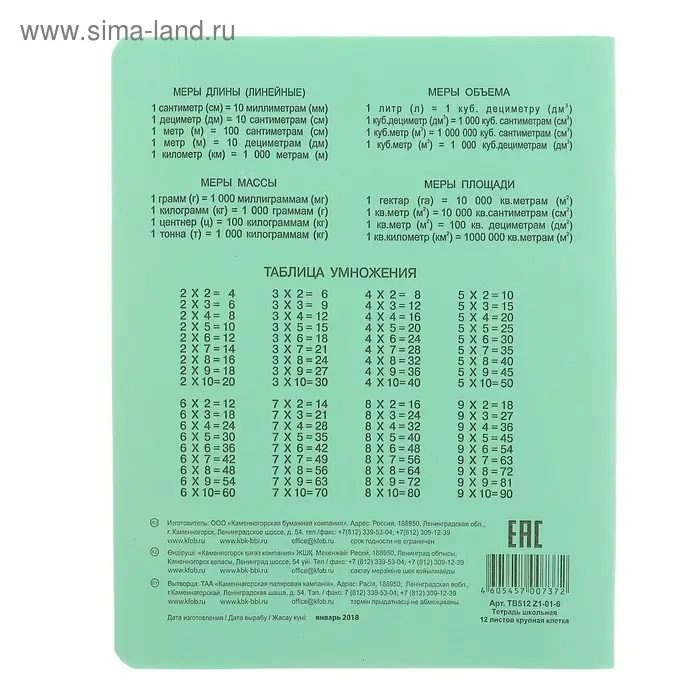Тетрадь 12 листов крупная клетка «Зелёная обложка», с таблицей умножения, термоупаковка 25 шт.