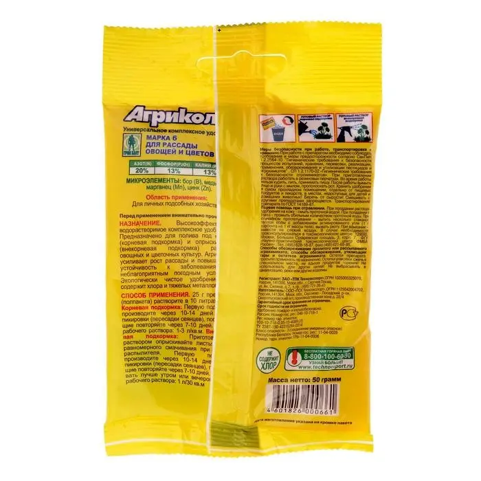 Удобрения включают полный сбалансированный набор макро- и микроэлементов, не содержат хлора и тяжёлых металлов. Правильный состав, учитывающий потребности растения в тот или иной период роста, своевременные подкормки удобрениями Агрикола препятствуют образованию нитратов в растениях.