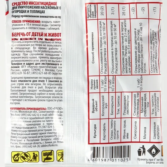 Для уничтожения насекомых вредителей в садах, огородах, теплицах вскрыть пакет, содержимое (8 г) таблетку растворить в воде и применять свежеприготовленный раствор в утренние и вечерние часы в сухую, безветренную погоду в соответствии с таблицей. Температура хранения и транспортировки препарата от –10° C до +45° C. Беречь от детей и животных. Хранить в сухом прохладном месте, отдельно от лекарств и пищевых продуктов. Вскрытая упаковка хранению не подлежит.