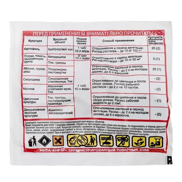 Инсектицид "Инта-вир" для уничтожения насекомых вредителей в садах, огородах, теплицах. Одну таблетку растворить в 10 литрах воды. Опрыскивание растений проводить свежеприготовленным раствором в сухую безветренную погоду обеспечивая равномерное смачивание листьев.