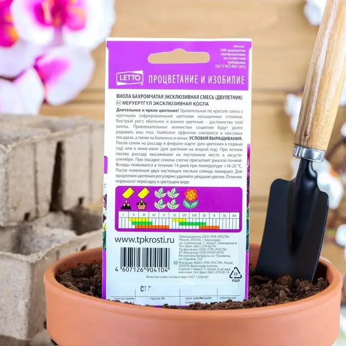 Быстрый рост, обильное и раннее цветение - достоинства этой виолы. Привлекательные волнистые соцветия будут долго радовать ваш глаз. Наиболее эффектно смотрятся в массовых посадках, а также на балконах и окнах. Для выращивания подходит любая хорошо дренированная почва и солнечное место или легкая полутень.Посев семян на рассаду февраль-март (для зацветания в первый год) или в июне-июле (для зацветания на второй год). При летнем посеве рассаду высаживают на постоянное место в августе-сентябре. При посадке семена слегка присыпают рыхлой почвой. Всходы появляются в течение 14 дней при температуре 16-20°С. После появления двух настоящих листьев сеянцы пикируют.