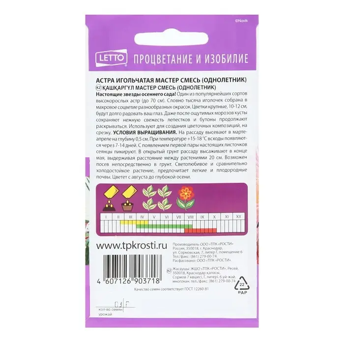 Высевают в марте-апреле на рассаду на глубину 0,5 см.При температуре 15-18° С всходы появляются через 5-8 дней.С появлением первой пары настоящих листочков сеянцы пикируют.В открытый грунт рассаду высаживают в конце мая, выдерживая расстояние между растениями 20 см.Возможен посев непосредственно в грунт.Астра светолюбивое и сравнительно холодостойкое растение, предпочитает почвы легкие и плодородные, без свежевнесенных органических удобрений.Цветет с августа до глубокой осени.