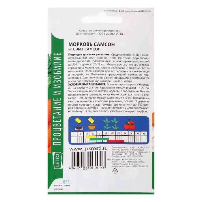 Подходит для всех регионов! Среднеспелый (112дн) высокоурожайный сорт моркови типа Нантская. Корнеплоды цилиндрические, тупоконечные, красно-оранжевые, массой до 200 г и длиною 20-22 см. Мякоть сочная, нежная, сладкая, сердцевина маленькая, плотно соединена с мякотью. Ботва небольшая. Предназначен для потребления в свежем виде и переработки. Отличается превосходной лежкостью корнеплодов. Для получения ранней продукции рекомендуется посев под зиму в конце октября - начале ноября.