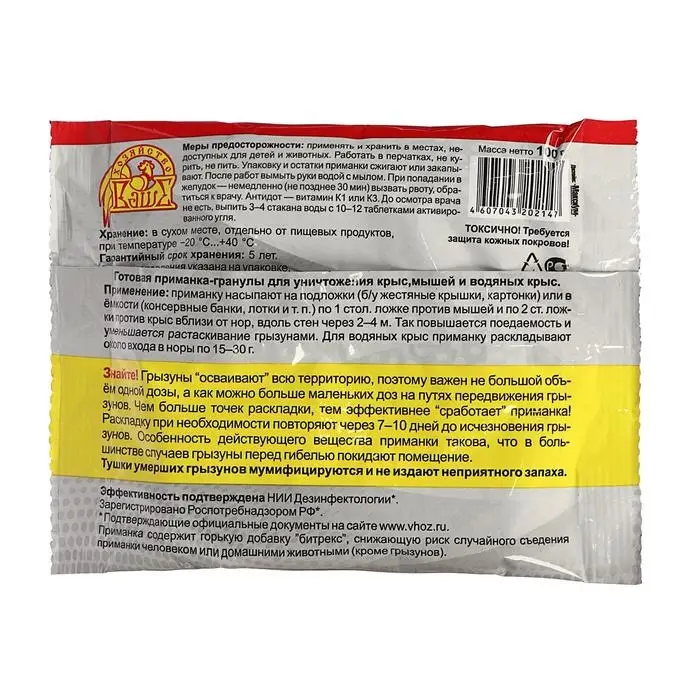 Меры предосторожности: применять и хранить в местах, недоступных для детей и животных. Работать в перчатках, не курить, не пить. Упаковку и остатки приманки сжигают или закапывают.