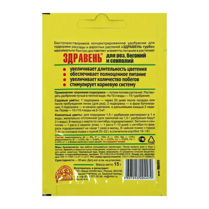 Удобрение "Здравень турбо" для роз, бегоний и сенполий, 15 г