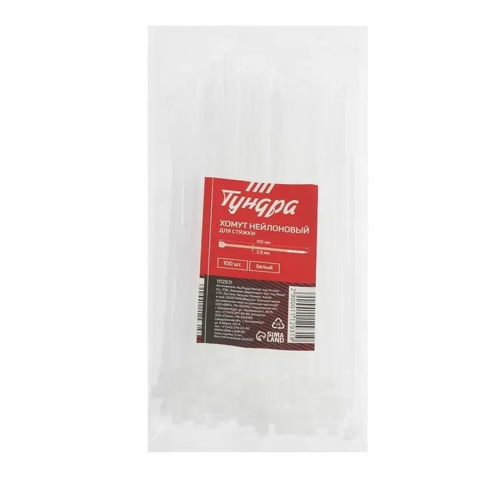 Хомут нейлоновый для стяжки, ТУНДРА, 2.5×150 мм, белый, 100 шт.