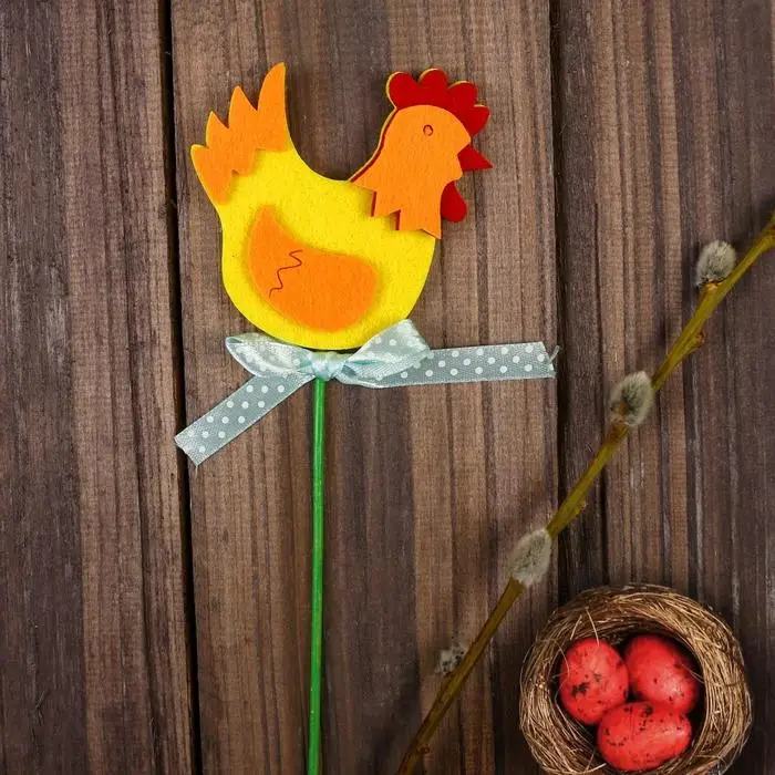 Топпер-декор «Курочка» будет прекрасным украшением праздничного стола и декором для композиции из пасхальных яиц. Цветочный горшок и букет станут более красивыми и оригинальными, если их дополнить сувениром на палочке.
