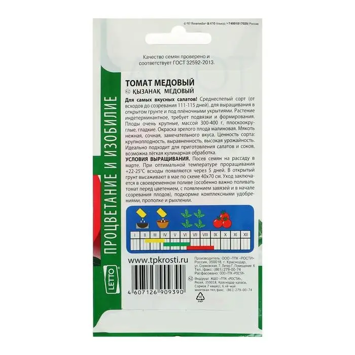 Семена «Томат Медовый», высокорослый, 0,2 г — среднеспелый сорт для выращивания в открытом грунте и плёночных теплицах. Период от всходов до начала созревания: 110–115 дней. Растение высотой 100–120 см, требует подвязки и формирования.