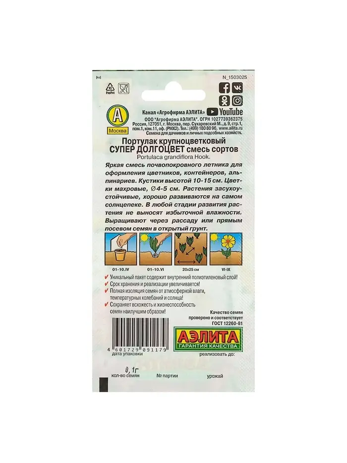 Семена цветов Портулак Крупноцветковый махровая смесь 0,05 г