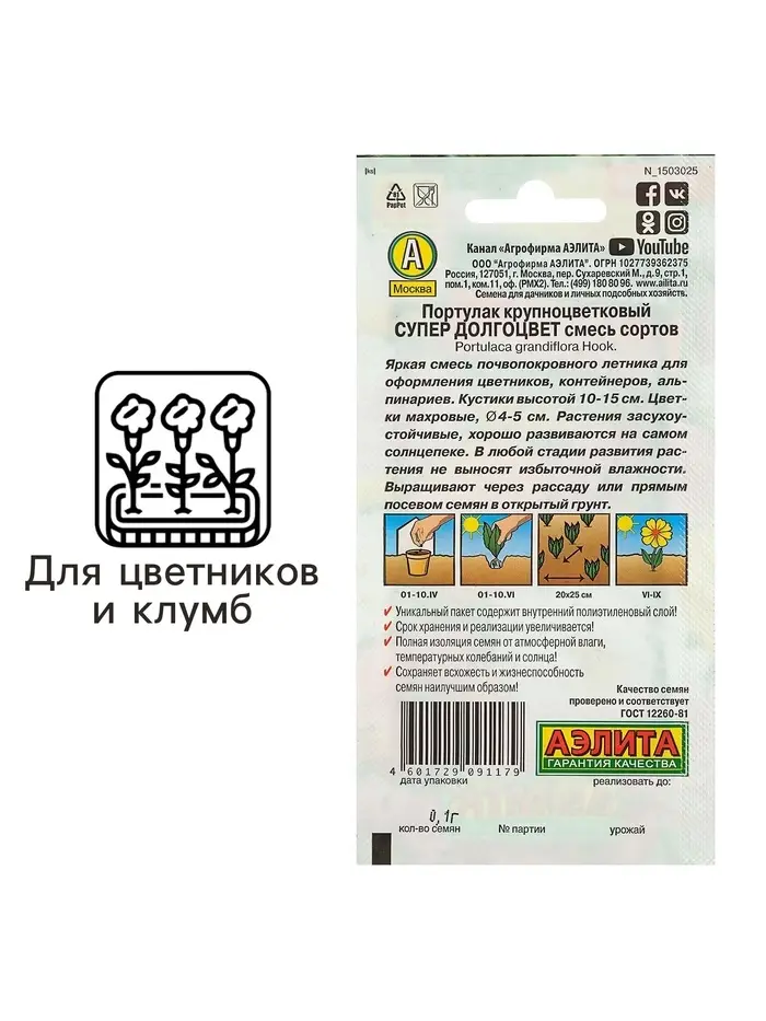 «Супер долгоцвет» представляет собой яркую смесь сортов почвопокровного летника. Низкорослые растения образуют аккуратные коврики с шелковистыми, махровыми цветками различных окрасок.