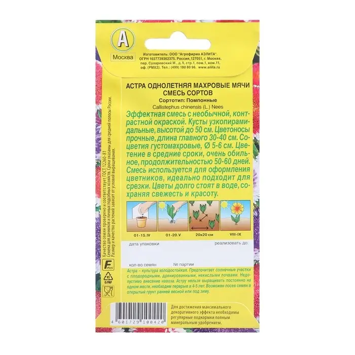Семена цветов Астра "Махровые мячи", смесь окрасок, О, 0,1 г