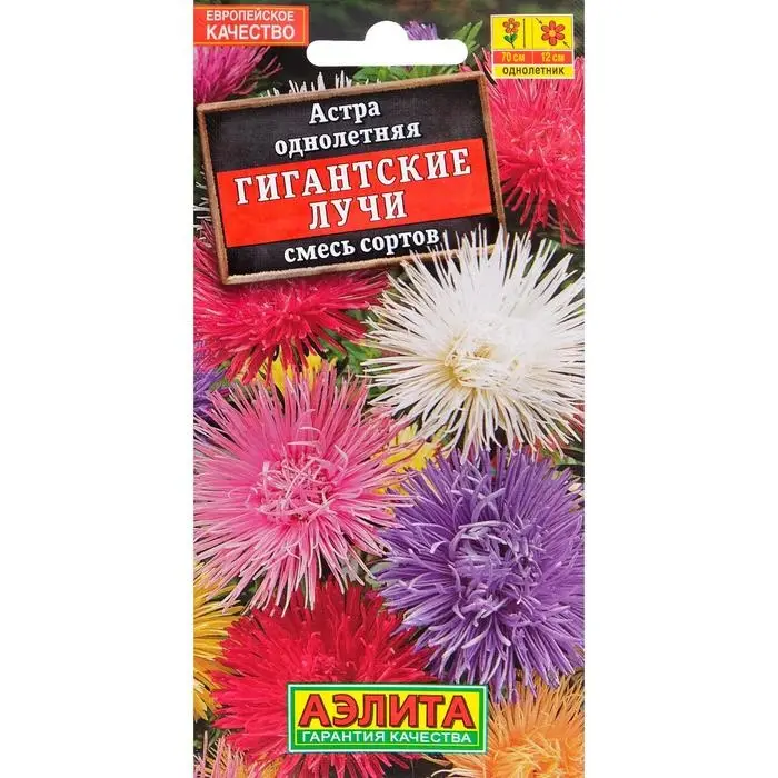 «Гигантские лучи» — смесь универсальных сортов однолетних астр для цветников и букетов. Срезанные соцветия сохраняют свежесть в воде до 14 дней. Растения холодостойкие, светолюбивые, не выносят застоя воды в почве.