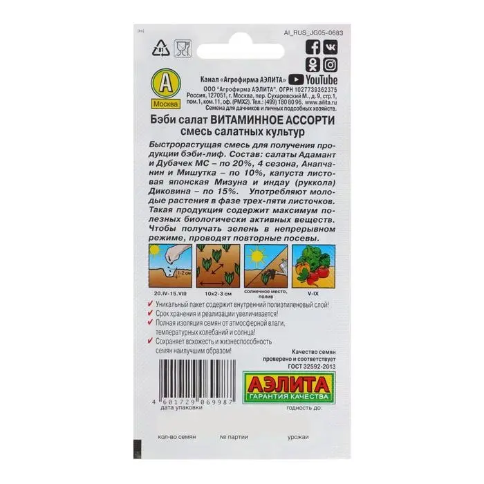 Смесь «Витаминное ассорти» включает салаты «Адамант», «Анапчанин», «Дубачек МС», «Мишутка», «4 сезона», капусту листовую японскую «Мизуна» и индау (рукколу) «Диковина». Растения содержат большое количество витаминов, минералов и микроэлементов.