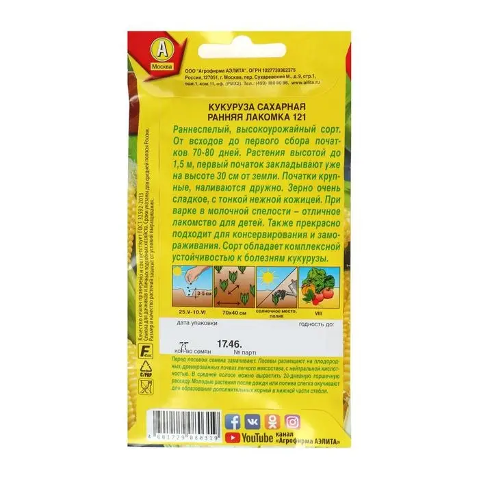 Семена Кукуруза сахарная "Ранняя лакомка 121", 7 г