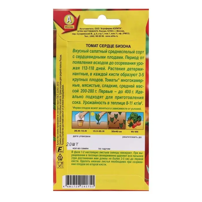 Удачный салатный сорт. Вступает в плодоношение в средние сроки, на 110–115 день от всходов. Ценится за великолепный вкус, крупноплодность, красивую форму. Вкус и аромат — наслаждение. Из красноплодных томатов по вкусу с данным сортом мало что сравнится. Растения среднерослые (1,5 м), детерминантные, слабо облиственные. Плоды красные, сердцевидные, мясистые, в меру сочные, малосемянные. Масса плода: 180–400 г. Ввиду крупноплодности для баночной консервации не подходит. Рекомендуется переработка на сок. Устойчив к погодным стрессам. Урожайность 9–10 кг/м².