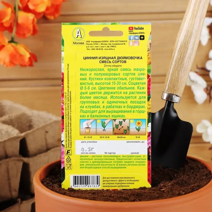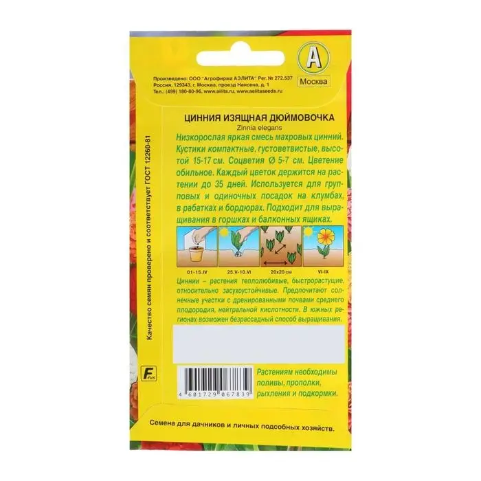 «Дюймовочка» представляет собой смесь сортов низкорослых ярких махровых цинний. Растения обильно и продолжительно цветут. Сорт неприхотливый, засухоустойчивый, предпочитает солнечное местоположение. Каждый цветок сохраняется на растении до 35 дней.