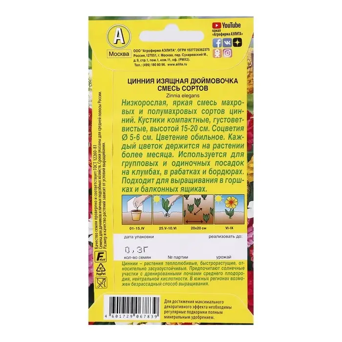 Семена цветов Цинния "Дюймовочка", смесь окрасок, О, 0,3 г