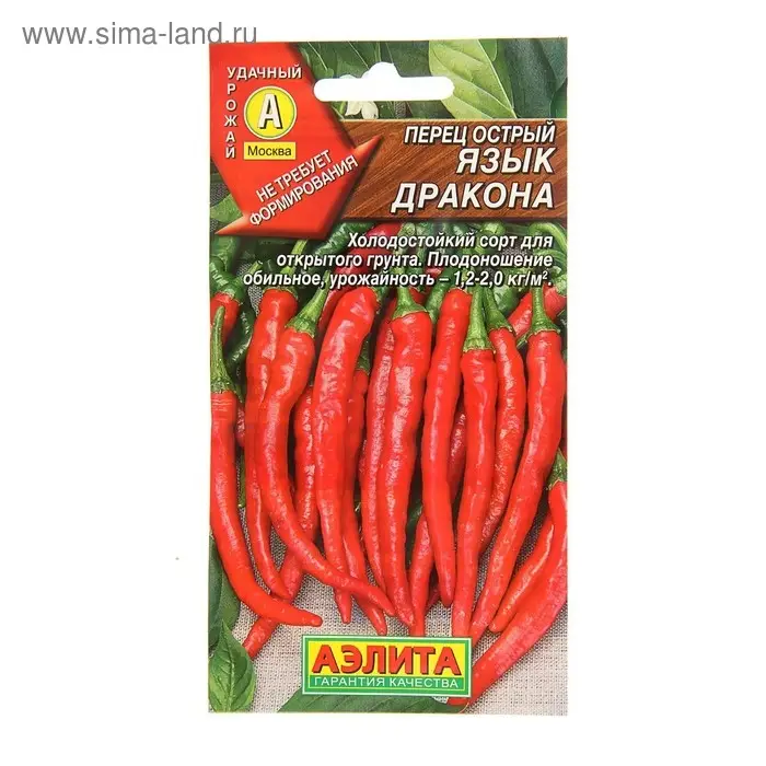 «Язык дракона» — это среднеспелый индетерминантный холодостойкий сорт для выращивания в открытом грунте и под плёночными укрытиями. Растение формирует хоботовидные глянцевые гладкие плоды с насыщенным острым вкусом, которые используются в домашней кулинарии для изготовления порошка и специй, а также подходят для консервирования.