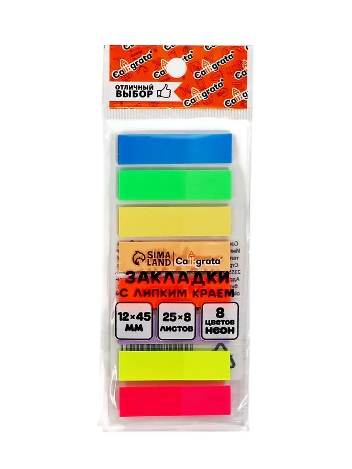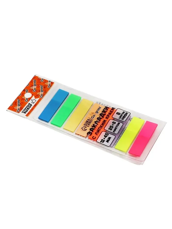 Блок-закладка с липким краем 12 мм х 45 мм, пластик, 8 цветов по 25 листов, флуоресцентный, в блистере